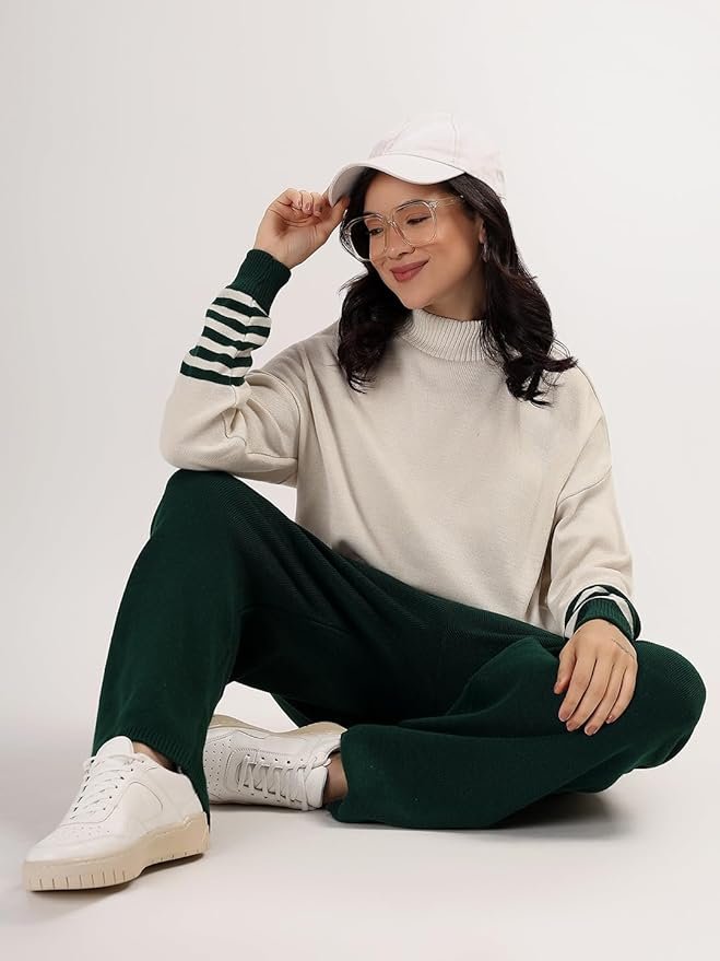 Stylish 2-Piece Winter Coord Set: Includes a cream full sleeve high neck sweater with striped design and wide-leg blue knit pants