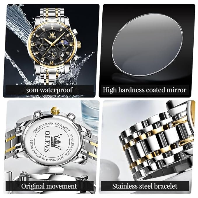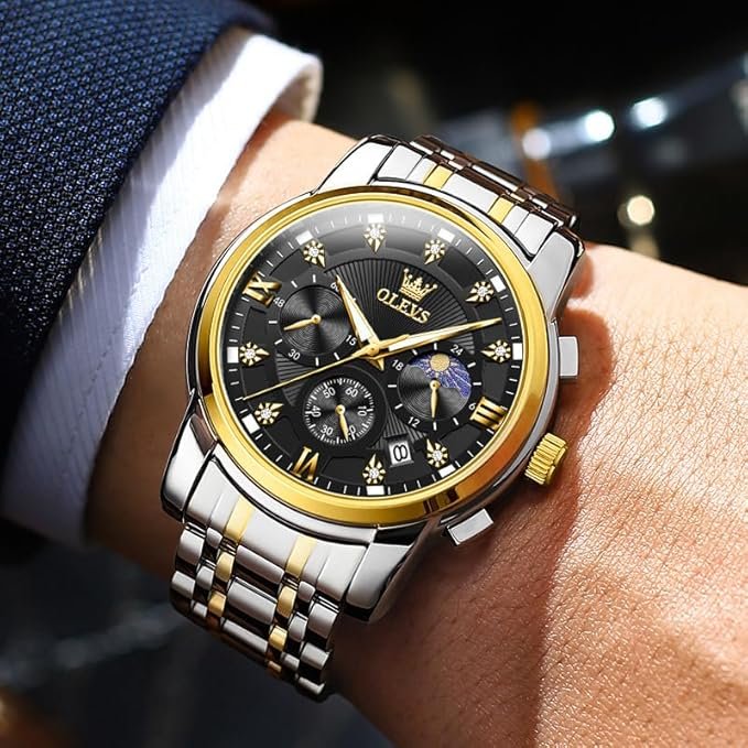 - ⌚Chronograph Quartz Watches: Featuring an original imported quartz movement, these watches offer a battery life of up to years. The watch face includes dials for chronograph and moon phase indication, backed by a quality guarantee ensuring steady and accurate timekeeping. It’s a must-have watches for the discerning gentleman’s wrist.