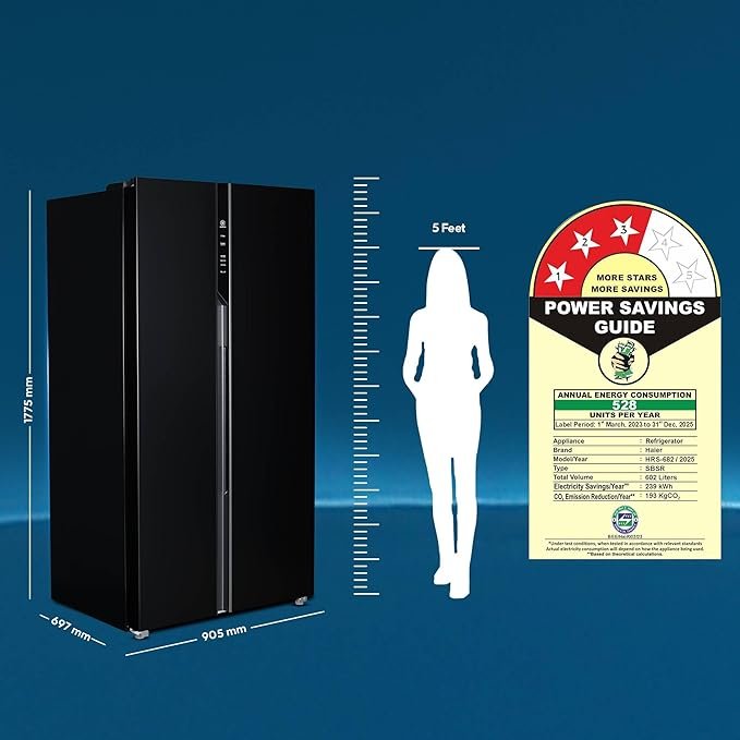 Haier 602L 3Star 2 Door Side by Side Frost Free Refrigerator|100% Convertible|Expert Inverter Technology|Digital Display Panel|Triple Twist Ice Maker|Deo Fresh Technology (HRS-682KS, Black Steel)