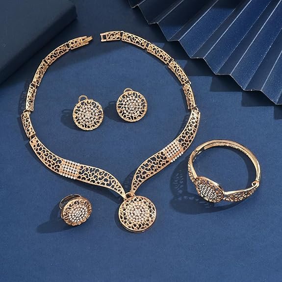 - This Jewellery Set contains Premium Quality Gold Plated Crystal Necklace with Bracelet, Ring and one pair of Earrings for women and girls. Perfect Party Jewellery Set with Sparking Crystal. Latest and Stylish Design.