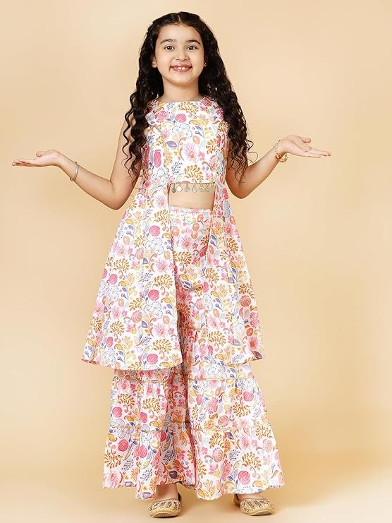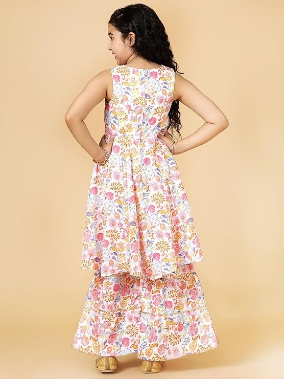 A.T.U.N. (ALL THINGS UBER NICE) Girls Poly Silk Floral Printed Sleeveless Sharara Set | Traditional Ethnic Wear Clothing Set for Festival and Special Occasions